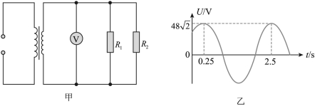 2. 某理想变压器如图甲,原副线圈匝数比4:1,输入电压随时间的变化图像如图乙,R1的阻值为R2的2倍,则( )