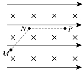 7. 空间中存在垂直纸面向里的匀强磁场B与水平向右的匀强电场E,一带电体在复合场中恰能沿着MN做匀速直线运动,MN与水平方向呈45°,NP水平向右。带电量为q,速度为v,质量为m,当粒子到N时,撤去磁场,一段时间后粒子经过P点,则( )