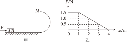 ,B与地面无摩擦,两物块用弹簧置于外力F的作用下向右前进,F与位移x的图如图乙所示,P为圆弧最低点,M为最高点,水平地面长度大于4m。