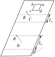15. 光滑斜面倾角为θ=30°,Ⅰ区域与Ⅱ区域均存在垂直斜面向外的匀强磁场,两区磁感应强度大小相等,均为B。正方形线框abcd质量为m,总电阻为R,同种材料制成且粗细均匀,Ⅰ区域长为L1,Ⅱ区域长为L2,两区域间无磁场的区域长度大于线框长度。线框从某一位置释放,cd边进入Ⅰ区域时速度为v,且直到ab边离开Ⅰ区域时速度均为v,当cd边进入Ⅱ区域时的速度和ab边离开Ⅱ区域时的速度一致,则: