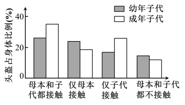 12. 僧帽蚤接触到天敌昆虫的气味分子(利它素)后,头盔会明显增大,从而降低被天敌昆虫捕食的风险。如图所示,僧帽蚤母本和子代接触利它素的情况不同,对子代头盔占身体比例的影响具有明显差异。下列分析错误的是( )