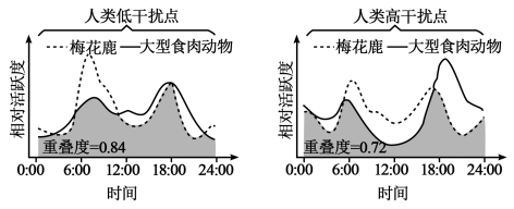 (3)如果大型食肉动物和梅花鹿每天的活动次数不变,据上图所示,从重叠度角度分析人类高干扰对大型食肉动物的影响是_____。