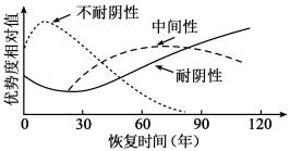 17. 某林地去除所有植被后,耐阴性不同的树种类群在植被恢复过程中优势度的变化如图所示。下列叙述正确的是( )