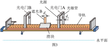 ②如图3,光电门中光源与光敏管相对,光源发出的光使光敏管感光。当滑块经过时,遮光条把光遮住,计时器记录遮光时间,可计算出滑块的速度。实验中使用的遮光条宽度