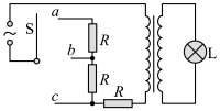 6. 如图,某小组设计了灯泡亮度可调的电路,a、b、c为固定的三个触点,理想变压器原、副线圈匝数比为k,灯泡L和三个电阻的阻值均恒为R,交变电源输出电压的有效值恒为U。开关S与不同触点相连,下列说法正确的是( )