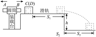10. 如图,某爆炸能量测量装置由装载台和滑轨等构成,C是可以在滑轨上运动的标准测量件,其规格可以根据测量需求进行调整。滑轨安装在高度为h的水平面上。测量时,将弹药放入装载台圆筒内,两端用物块A和B封装,装载台与滑轨等高。引爆后,假设弹药释放的能量完全转化为A和B的动能。极短时间内B嵌入C中形成组合体D,D与滑轨间的动摩擦因数为