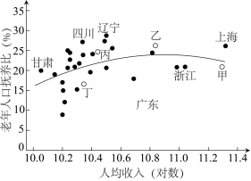 老年人口抚养比是指一个地区老年人口数与劳动年龄人口数的比值。下图为“2022年我国部分省级行政区老年人口抚养比与人均收入的关系图”。完成下面小题。