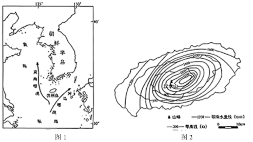 材料二:图1为“济州岛位置及周边洋流分布示意图”,图2为“济州岛地形及年降水量分布图”。