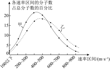 8. 一定质量的理想气体,体积保持不变。在甲、乙两个状态下,该气体分子速率分布图像如图所示。与状态甲相比,该气体在状态乙时( )