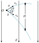 13. 如图所示,在电场强度为E,方向竖直向下的匀强电场中,两个相同的带正电粒子a、b同时从O点以初速度