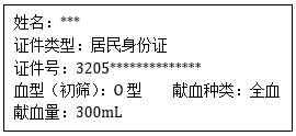 10. 我国实行无偿献血制度,提倡18~55周岁的健康公民积极参加无偿献血行动。下图是某成年人献血证的部分信息。下列相关叙述错误的是( )