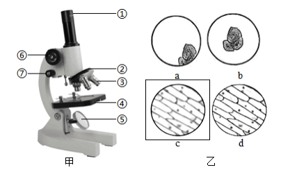 42. 同学们进行了“观察洋葱鳞片叶表皮细胞和人口腔上皮细胞临时装片”的实验。图甲是用于观察的显微镜,图乙为显微镜下看到的几个视野。请回答下列问题。