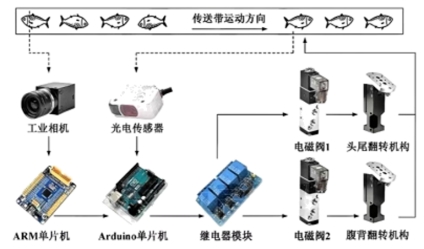 如图所示是一种鲐鱼鱼体姿态控制系统的示意图,其工作过程是:鱼体以随机姿态逐条送入传送带,ARM单片机根据工业相机采集的鱼体图像判断出鱼体姿态,并发送信号给Arduino单片机。当光电传感器检测到鱼体到达作业位置时,发送信号给Arduino单片机,Arduino单片机结合鱼体姿态,通过继电器模块驱动电磁阀来控制相应机构将鱼体调整成设定姿态。