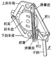 7. 如图所示的刹车装置,刹车盘通过转轴安装在机架上,刹车臂、手柄通过销轴安装在机架上。手柄在力F的作用下转动,通过杆1和杆2带动上、下刹车臂抱紧刹车盘,从而实现刹车。撤去力F后,弹簧使装置复位。下列关于该刹车装置的分析,不正确的是( )