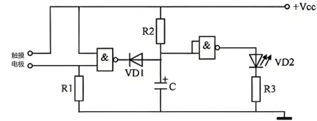 10. 小明准备在印制电路板上制作如图所示的触摸延时灯实验电路。下列表述中,合理的是( )