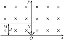 直角坐标系中,x轴上方存在垂直纸面向里的匀强磁场,磁感应强度大小为B。在第二象限内,垂直纸面且平行于x轴放置足够长的探测薄板MN,MN到x轴的距离为d,上、下表面均能接收粒子。位于原点O的粒子源,沿
