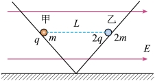 10. 如图,两个倾角相等、底端相连的光滑绝缘轨道被固定在竖直平面内,空间存在平行于该竖直平面水平向右的匀强电场。带正电的甲、乙小球(均可视为质点)在轨道上同一高度保持静止,间距为L,甲、乙所带电荷量分别为q、