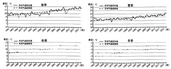2023年7月,联合国秘书长在一份声明中称:“全球沸腾的时代到来了。”读“1961~2023年我国各季节逐年平均气温变化图”,回答3~4题。