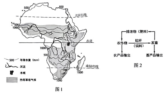 材料一:非洲热带草原气候区(图1)是非洲主要农业区,进一步发展农业生产的潜力巨大。但由于种种原因,该区域有的地区单纯耕作,不养家畜;而有的地区单纯放牧,不事耕作;两种农业类型相对独立,彼此分离。