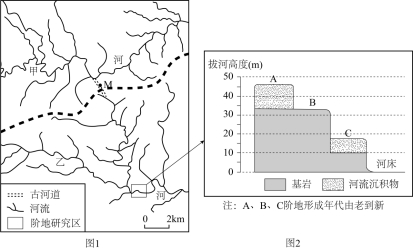 图1示意甲、乙两河的部分流域。约7万年前,该区域发生了河流袭夺。图2示意乙河阶地研究区的阶地剖面模式。