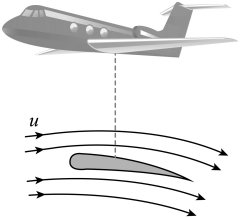 (3)无风时,飞机以速率u水平向前匀速飞行,相当于气流以速率u相对飞机向后运动。气流掠过飞机机翼,方向改变,沿机翼向后下方运动,如图所示。请建立合理的物理模型,论证气流对机翼竖直向上的作用力大小F与u的关系满足