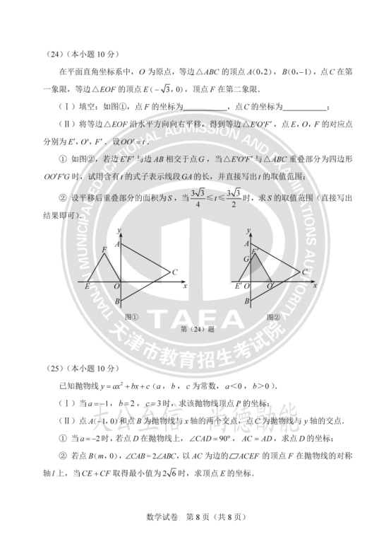 2018天津中考数学试卷及答案I、Ⅱ(已公布)