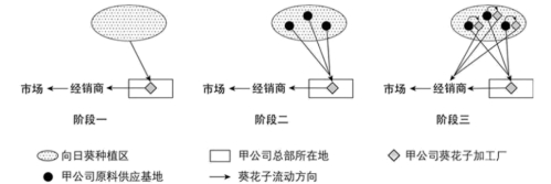 (3)结合材料可知,阶段三甲公司在原料供应积极建立葵花子加工厂。主要考虑以下方面:葵花子加工厂临近向日葵种植基地(原料产地),有助于降低原料运输成本,从而降低生产成本。葵花子在收获后可以第一时间运送至加工厂进行加工,可以有效降低葵花子的损耗,提高原料的利用率,保证葵花子的品质。葵花子种植基地附近地价较低,可以有效降低用地成本、节约生产成本。葵花子加工基地布局在原料产地附近也可以借助当地的政策优势(优惠政策),有助于拓展当地市场。