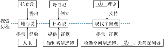 10. 对《宇宙探秘》相关内容进行梳理,图中①、②位置内容填写正确的是( )