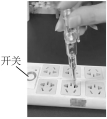 17. 如图,测电笔的氖管发光,所测孔连接的是______线。多个用电器同时插入插线板都能独立工作,各用电器是______联的。断开插线板上的开关,所有插孔都不能供电,表明开关连接在______路上。三孔插座中间的插孔接地,将用电器的______与大地相连,目的是防止触电。