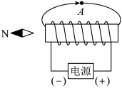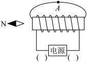 (2)如图,根据小磁针静止时N极的指向,标出A处的磁感线方向和电源正、负极。
