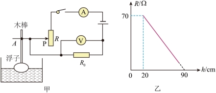 为定值电阻,条状变阻器R的最大阻值为70Ω,浮子可带动连接导线的水平金属杆AP上下移动。给水箱加水至预定水位的过程中,电压表的最大示数为12V,电流表示数变化的范围为0.2~0.6A,变阻器接入电路的阻值随水位的变化关系如图乙所示,则定值电阻