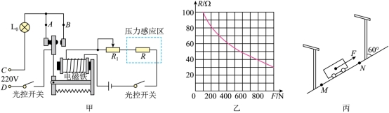 26.为了节约电能又不影响照明,工人师傅设计出一个路灯改造方案。此前,每个路灯装有一只“220V 100W”的灯泡L0。此次改造要为每个路灯加装一只相同规格的灯泡L,并安装一个电磁控制感应装置,当夜幕降临时,光控开关闭合,路灯处于低功率的柔光状态;当行人走进感应区时,灯光瞬间变亮,离开感应区时,路灯又恢复原来的柔光状态。图甲是设计的电路(加装的灯泡L未画出),控制电路的电源电压恒为4.5V,压敏电阻R的阻值随压力大小变化的图像如图乙所示,当通过电磁铁的电流等于或大于临界值时,衔铁会被电磁铁吸引而转换触点。工作电路的电源电压220V不变,不考虑灯丝电阻变化,电磁铁线圈电阻忽略不计。