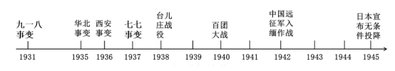 示意图:题干要求列明中国在世界反法西斯战争中的贡献,中国的贡献主要是抗日战争,时间轴列出抗日战争的相关史实,强调中国在其中的贡献,如: