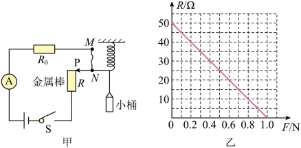 装置设计图。电源电压为12V,R?为一定值电阻,MN间是足够长的轻质导线,金属棒竖直固定且粗细均匀。一弹簧上端固定,滑片P固定在弹簧下端,与金属棒之间无摩擦且接触良好。已知金属棒接入电路的阻值R与弹簧所受拉力F的关系如图乙所示。容积为40cm3的小桶通过轻绳挂在弹簧下端,闭合开关S,桶内未装液体时,电流表示数为0.2A;测量密度时,需在桶内装满待测液体,通过读取电流表示数可得出液体密度。(不计弹簧、滑片及小桶的质量)