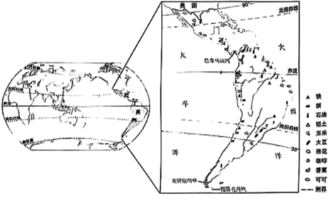 资料三拉丁美洲在世界的位置及部分物产分布示意图。