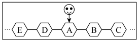 ”位于格子A时,小明连续点击两次按钮,“