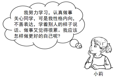 关键词:我努力学习,认真做事,关心同学;我性格内向,不善表达,学着别人的样子说话,做事又觉得很累→可链接扬长避短;欣赏接纳自己;不断激发潜能。