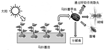 【详解】(1)生产者通过光合作用将太阳能(或光能)转化为化学能,储存在有机物中,所以马铃薯将无机物合成有机物所需的能量来自太阳能(或光能)。