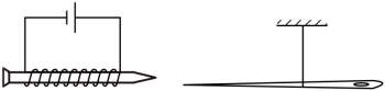 13.小明在户外实践中,利用随身所带物品制作了简易指南针。他首先利用电池、带绝缘皮的导线、铁钉制成电磁铁,然后将缝衣针磁化并用细线水平悬挂,最后将两者靠近,静止时位置关系如图所示。下列说法正确的是( )