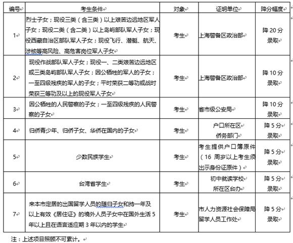 2017年上海市中等学校高中阶段招生录取政策性照顾项目一览表