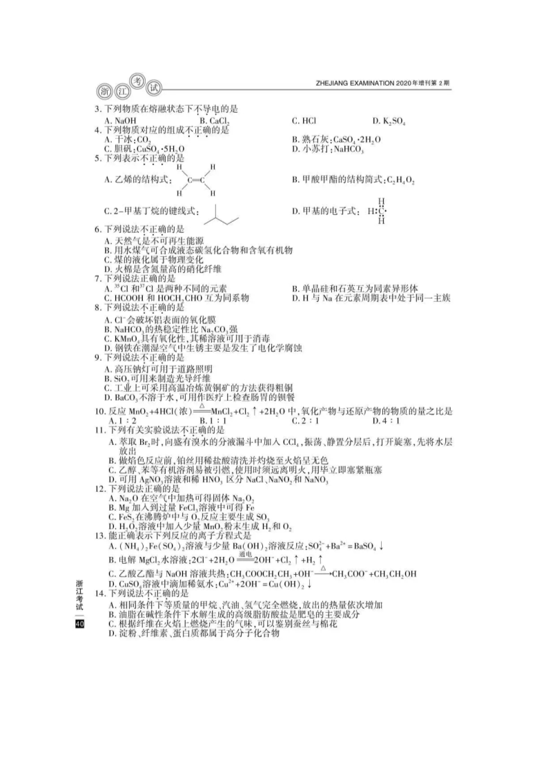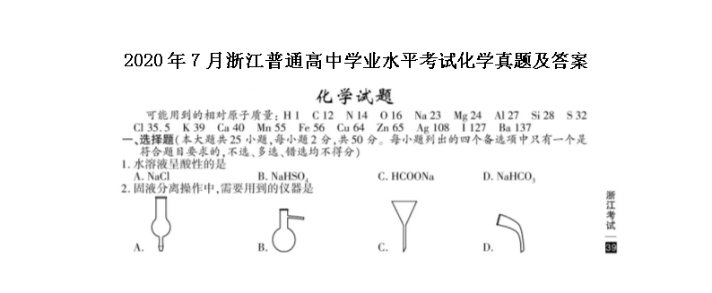 2020年7月浙江普通高中学业水平考试化学真题及答案