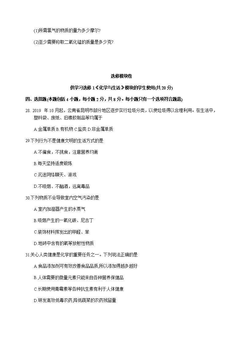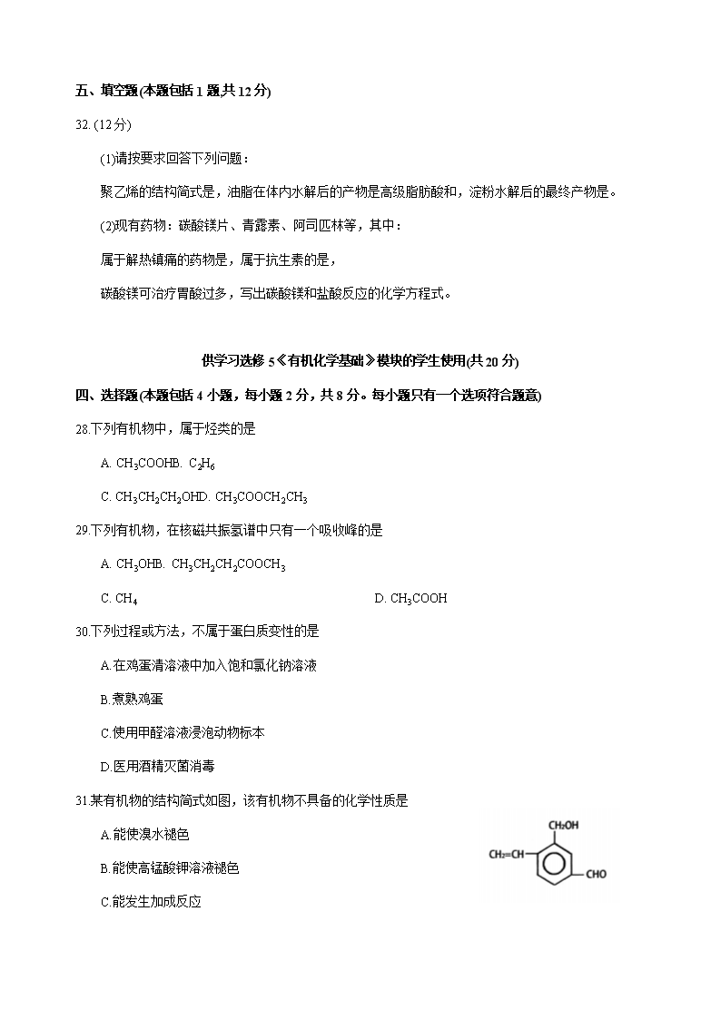[考生注意]:本试卷分为必修模块卷和选修模块卷。必修模块卷为全体考生必做。选修模块卷含选修1《化学与生活》、选修5《有机化学基础》,由考生任选其中一个模块作答。必须在答题卡上指定位置按规定要求作答,答在试卷上一律无效。