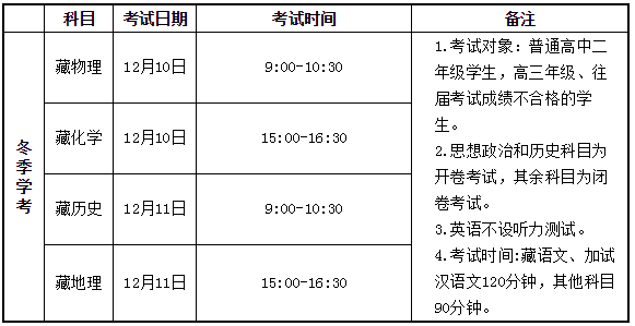 2020年冬季甘肃酒泉普通高中会考科目为物理、化学、历史、地理;藏物理(翻译卷)、藏化学(翻译卷)、藏历史(翻译卷)、藏地理(翻译卷)。