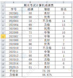 第4题、在Excel的Sheet 1工作表的A1:D19单元格内创建“期末考试计算机成绩表”(内容如下图所示),按题目要求完成后,用Excel的保存功能直接存盘。(表格没创建在指定区域将不得分)