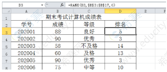 3、在排名列相应单元格内用RANK函数计算学生的排名。