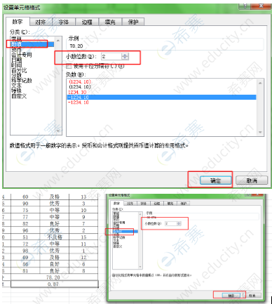 6) 单元格格式设置平均分保留2位,及格率用百分比保留两位。