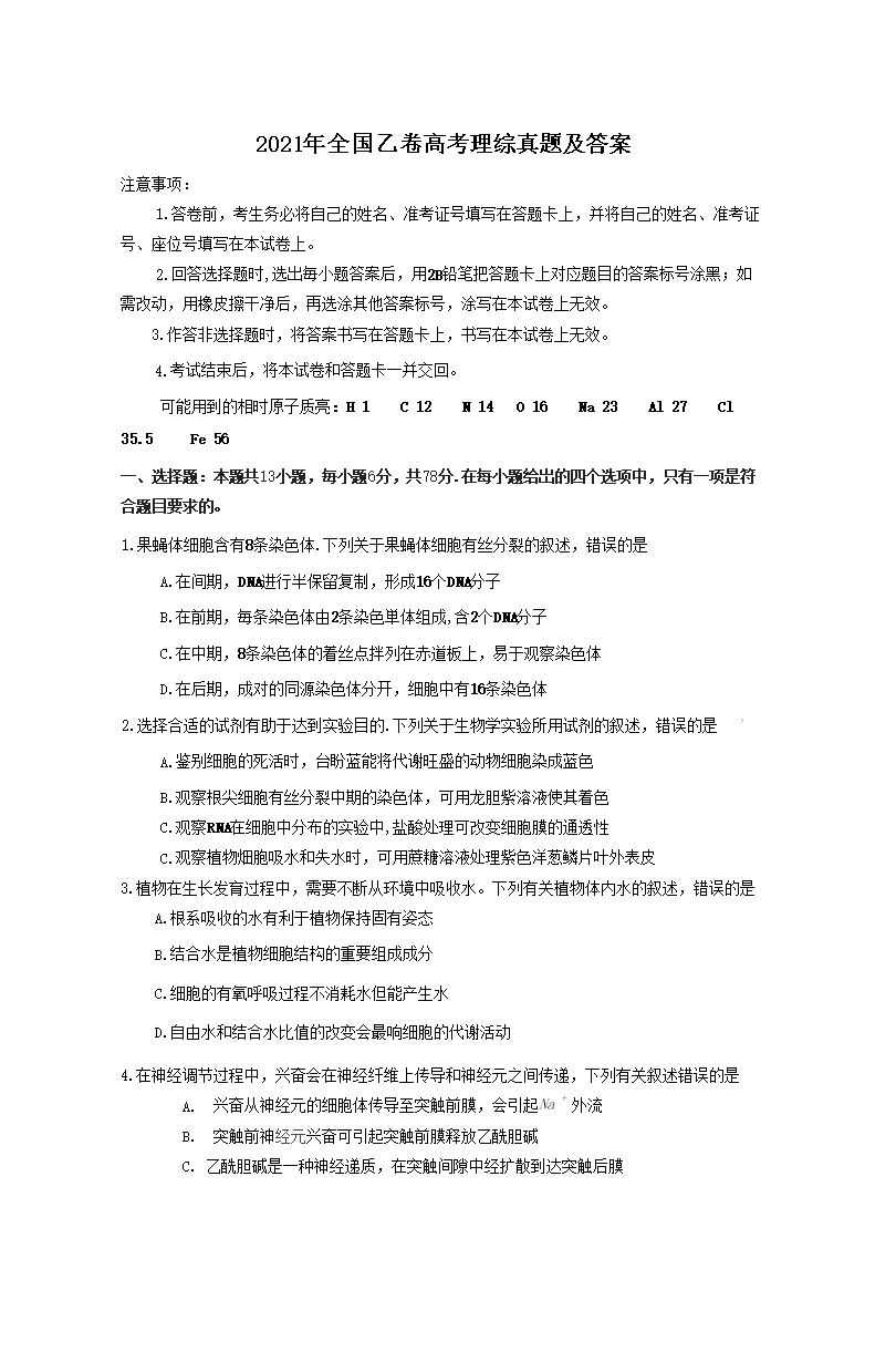 2021年全国乙卷高考理综真题及答案