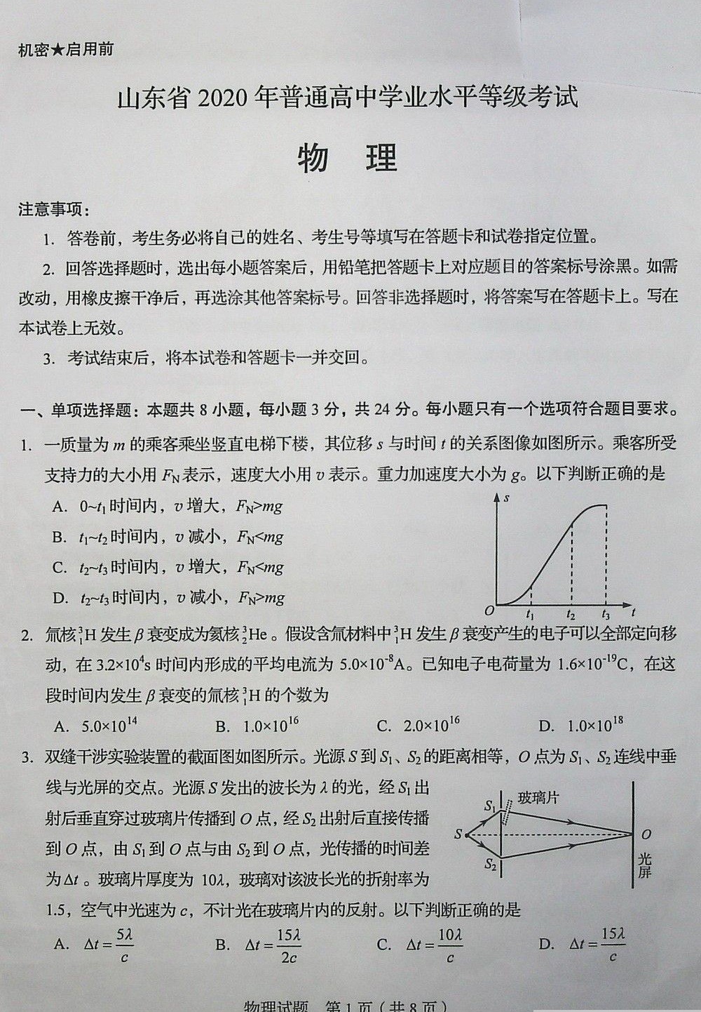 2020年山东普通高中学业水平等级考试物理试题及答案