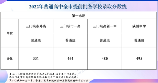 三门峡2022年普通高中全市提前批各学校录取分数线