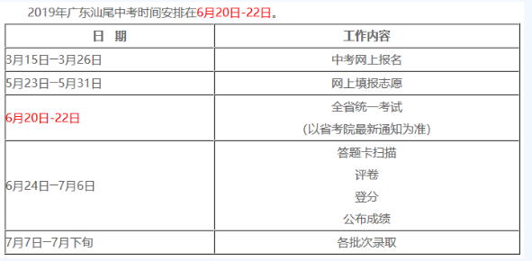 2020年汕尾中考时间安排:6月20日-22日